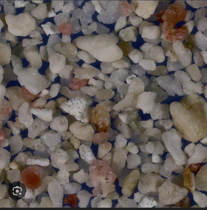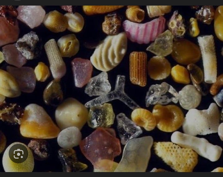 ID: a highly magnified photo of sand, including shell bits and glass formations in many colors.