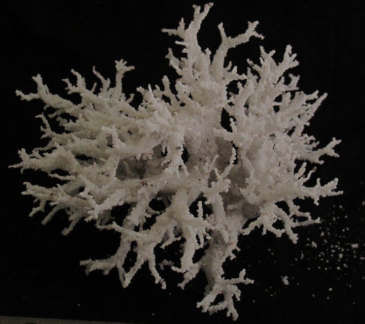 ID: Fulgarite: glass shapes formed by lightning strikes on beach sand. It is branched like a coral and white.